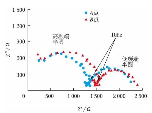 圖3所示是在NS4溶液中試樣表面A點和B點(如圖1所示)的LEIS點測量圖。從圖3可以發現,兩點的測量圖譜具有相同的特征,都是在整個頻率范圍內有兩個半圓弧組成;所不同的是,B點在高頻端半圓弧較A點明顯一些,然而在低頻端半圓弧卻是基本相同。因為阻抗圖譜包含兩個半圓弧,因此普遍認為高頻端半圓弧與腐蝕產物層或氧化膜有關,而低頻端半圓弧與界面的電子轉移反應有直接聯系。一個大尺寸的半圓弧意味著一個高的膜阻抗或電荷轉移阻抗。因此,隨著半圓弧尺寸的增加,腐蝕阻抗隨之增加。