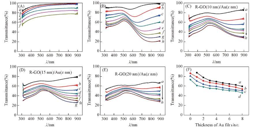 在可見(jiàn)光波段(400——750 nm)的透過(guò)率是評(píng)判透明電極的重要指標(biāo)之一。為了考察R-GO/Au微電極的光學(xué)性能,首先測(cè)量了GO、R-GO薄膜以及不同厚度的Au薄膜在可見(jiàn)光波段的透過(guò)率,結(jié)果如圖3(A)和(B)所示。厚度分別為10,15和20 nm的GO薄膜具有很高的透過(guò)率,在可見(jiàn)光波段的透過(guò)率大于90%.盡管經(jīng)過(guò)肼蒸汽還原后R-GO薄膜的透過(guò)率有所下降,但是10 nm厚的R-GO薄膜在可見(jiàn)光波段的透過(guò)率仍然大于80%.從Au薄膜的透過(guò)率曲線可以看出,超薄Au薄膜在可見(jiàn)光波段透過(guò)率較高,隨著Au厚度的增加其透過(guò)率逐漸下降。圖3(C)——(E)給出了不同R-GO和Au厚度的R-GO/Au復(fù)合電極的透過(guò)率曲線,為了避免微圖案化陣列對(duì)電極透過(guò)率的影響,在表征復(fù)合電極透過(guò)率的過(guò)程中采用大面積無(wú)微圖案化的R-GO/Au樣品。圖3(F)給出R-GO、Au以及R-GO/Au復(fù)合薄膜在550 nm波長(zhǎng)下的透過(guò)率。可以看出,與R-GO薄膜以及Au薄膜相比,復(fù)合電極的透過(guò)率有所下降,并且與R-GO以及Au的厚度有直接的關(guān)聯(lián),以R-GO(10 nm)/Au(4 nm)樣品為例,其對(duì)550 nm波長(zhǎng)光的透過(guò)率為70%,這樣較高的透過(guò)率可以滿足透明/半透明電極的要求。如果進(jìn)一步考慮微圖案化陣列對(duì)微電極透過(guò)率的影響,可以預(yù)期R-GO/Au復(fù)合微電極陣列整體在可見(jiàn)光波段具有更高的透過(guò)率。