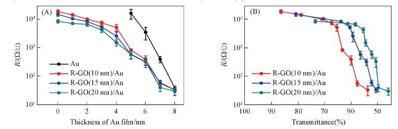 利用四探針測(cè)量電阻的方法對(duì)R-GO/Au復(fù)合微電極的電學(xué)性能進(jìn)行了評(píng)估,測(cè)試了R-GO/Au復(fù)合微電極在不同R-GO和Au厚度時(shí)的表面電阻(Rs),結(jié)果如圖4(A)所示。在R-GO電極上引入Au薄膜可以有效提高其導(dǎo)電性,并且Rs與復(fù)合電極薄膜的厚度緊密相關(guān),隨著R-GO和Au厚度的增加,Rs迅速降低,當(dāng)復(fù)合電極中R-GO和Au的厚度分別為20和7 nm時(shí),復(fù)合電極的Rs約為35Ω/□。單獨(dú)的Au薄膜由于在沉積過(guò)程中按照“Volmer-Weber”模式生長(zhǎng),形成不連續(xù)的島狀結(jié)構(gòu),所以在只有幾納米厚的條件下,其電阻率非常大。從圖4(A)中可以看出,在厚度小于5 nm時(shí),Au薄膜幾乎不導(dǎo)電,5 nm厚的Au薄膜的表面電阻Rs平均約為17 kΩ/□,而5 nm的Au與R-GO復(fù)合電極的Rs約為0.5 kΩ/□,Rs(Au)比Rs(R-GO/Au)高2個(gè)數(shù)量級(jí);雖然增加Au薄膜的厚度可以有效地減少Rs(Au),但是Rs(Au)依舊比Rs(R-GO/Au)高1——2個(gè)數(shù)量級(jí),直到Au的厚度增加到8 nm以上時(shí),Rs(Au)與Rs(R-GO/Au)才比較相近。圖4(B)給出了R-GO/Au復(fù)合電極的表面電阻和透過(guò)率的關(guān)系曲線,根據(jù)實(shí)際器件中透明電極對(duì)表面電阻和透過(guò)率的需求,結(jié)合圖4(B)可以對(duì)復(fù)合電極各層的厚度進(jìn)行設(shè)計(jì)。