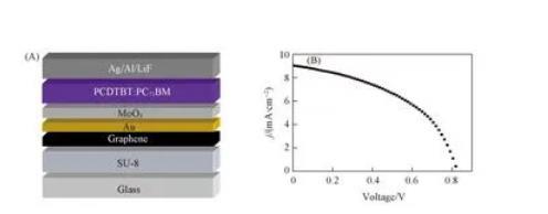 為了進(jìn)一步對(duì)R-GO/Au復(fù)合微電極陣列的光電性能進(jìn)行評(píng)估,利用復(fù)合微電極陣列作為半透明陽(yáng)極制備了OPVs,器件結(jié)構(gòu)為復(fù)合微電極陣列/MoO3/PCDTBT∶PC71BM/LiF/Al/Ag[如圖5(A)所示].采用的復(fù)合微電極陣列中R-GO的厚度為10 nm,Au的厚度為7 nm,相應(yīng)復(fù)合電極的表面電阻為56Ω/□,對(duì)于550 nm波長(zhǎng)光的透過(guò)率為59%.對(duì)制備的基于R-GO/Au復(fù)合微電極陣列的OPVs器件的性能進(jìn)行了表征[圖5(B)],器件的開(kāi)路電壓為0.82 V,短路電流密度為9.05 mA/cm2,填充因子為46.31%,光電轉(zhuǎn)換效率為3.43%.由實(shí)驗(yàn)結(jié)果可以看出,所制備的周期性R-GO/Au復(fù)合微電極陣列具有較好的光電性能,能夠滿足透明電極的要求,可以應(yīng)用于微器件中。