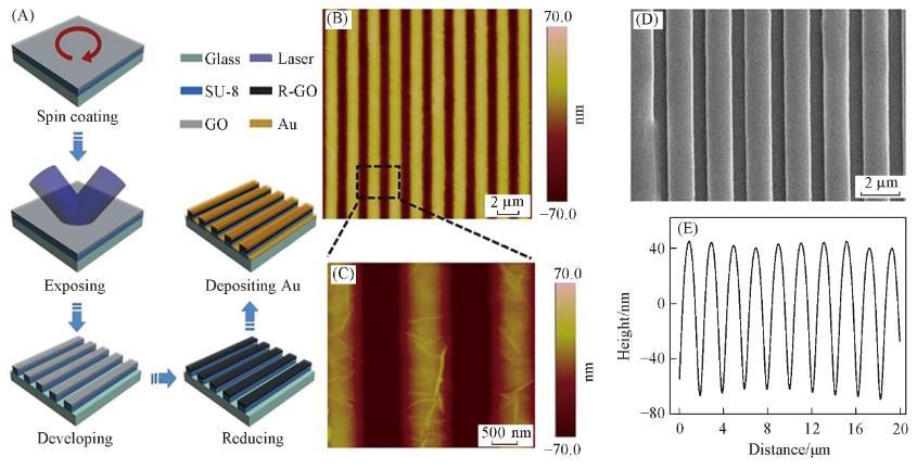 利用雙光束干涉~無(wú)掩模光刻技術(shù)制備R-GO/Au復(fù)合微電極陣列,工藝過(guò)程如圖1(A)所示。利用兩束波長(zhǎng)為266 nm的激光干涉形成的場(chǎng)強(qiáng)周期性變化的光場(chǎng)對(duì)SU-8/GO結(jié)構(gòu)進(jìn)行曝光。由于SU-8具有光敏特性,在紫外曝光時(shí)會(huì)發(fā)生交聯(lián),因此代表光場(chǎng)強(qiáng)弱變化的周期性條紋被SU-8層所記錄,在經(jīng)歷顯影工藝過(guò)程之后,未曝光部分的SU-8攜帶其上層覆蓋的GO被去除,從而獲得與干涉圖樣相對(duì)應(yīng)的周期性GO陣列。通過(guò)改變兩束相干光之間的夾角可以有效地控制所制備的GO陣列的周期。利用肼蒸汽對(duì)制備的GO陣列進(jìn)行脫氧還原,從而獲得R-GO陣列。為了進(jìn)一步提高R-GO微電極的導(dǎo)電性,利用物理氣相沉積工藝在微電極表面蒸鍍一層超薄Au薄膜。在蒸鍍Au薄膜之前,R-GO微結(jié)構(gòu)之間的凹槽處為裸露的玻璃襯底,在蒸鍍Au薄膜的過(guò)程中,由于Au與玻璃襯底之間表面能的失配,沉積在R-GO條紋之間的超薄Au薄膜按照“Volmer-Weber”生長(zhǎng)模式形成不連續(xù)的島狀結(jié)構(gòu),其導(dǎo)電性很差,與R-GO/Au復(fù)合薄膜相比,其導(dǎo)電性可以忽略。因此在本實(shí)驗(yàn)中,不考慮微結(jié)構(gòu)之間凹槽處的超薄Au薄膜對(duì)R-GO/Au復(fù)合微電極陣列的影響。