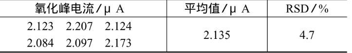 對2.5 mmol/L的AA標準工作溶液平行測定6次,氧化峰電流測定結果的相對標準偏差為4.7%,說明電極具有良好的重現(xiàn)性,試驗結果見表2。