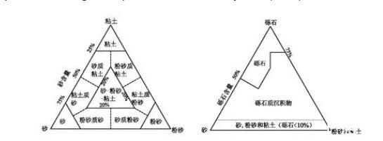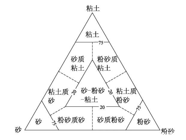 淺海沉積物主要源于陸源碎屑沉積,因此物質(zhì)組成與陸源物質(zhì)非常相似。碎屑沉積物根據(jù)其粒度特征可以分為礫、砂、粉砂和粘土四大類,這4種不同粒級(jí)組分的百分含量是沉積物分類與命名的基礎(chǔ)。粒級(jí)的劃分目前主要采用Udden-Wentworth的方案。1954年謝帕德總結(jié)了美國工程界、土壤界以及石油界對(duì)碎屑沉積物的分類方案,并提出新的分類方法,即謝帕德(1954)分類(圖1)。該方案被廣大沉積學(xué)者普遍接受,在海洋地質(zhì)學(xué)界推廣使用。1970年福克又在礫石、砂和泥的分類基礎(chǔ)上提出了一種新的分類方案,即福克(1970)分類。