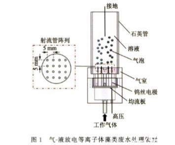 由聚四氟乙烯加工成柱體腔室,氣體從腔室底部開孔處注入,通過配氣室頂部毛細(xì)管陣列流入儲液池。當(dāng)儲液池液體接地,且鎢絲電極連通交流高壓后,則會在毛細(xì)管口位置的氣泡內(nèi)形成微放電陣列,產(chǎn)生大量的活性粒子、自由基并與藻類廢水相接觸,以此來殺除廢液中的小球藻。