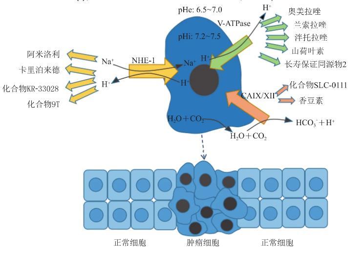 另外,胞內(nèi)生成的CO2彌散到胞外,腫瘤缺氧的狀態(tài)活化了缺氧誘導因子1(HIF-1),誘導腫瘤細胞高表達CA,催化CO2和H2O反應生成碳酸。綜上所述,乳酸和CO2是腫瘤酸性環(huán)境產(chǎn)生的兩大物質(zhì)基礎(chǔ)。腫瘤細胞無法在pHi過低的條件下長期生存,因此必須通過某些機制將酸性產(chǎn)物不斷排出細胞外而維持胞內(nèi)pH穩(wěn)定。乳酸產(chǎn)生后,一些氫離子和乳酸根被單羧酸鹽轉(zhuǎn)運蛋白(monocarboxylate transporter,MCT)以共轉(zhuǎn)運的方式運輸?shù)郊毎?,大部分的氫離子則被細胞膜上眾多激活的離子轉(zhuǎn)運蛋白運至細胞外或泵入某些細胞器中,最終導致腫瘤細胞在維持胞內(nèi)pH呈中性至堿性的同時,胞外及胞內(nèi)一些細胞器(如內(nèi)涵體、溶酶體)的pH明顯降低。