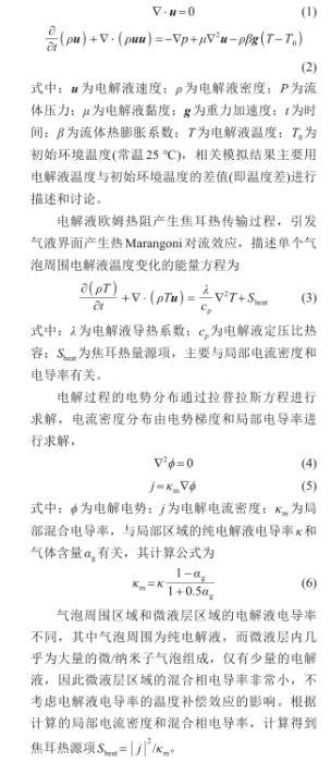本文作者基于前期獲得的水平微電極表面單個氫氣泡生長行為實驗數(shù)據(jù),采用固定氣泡直徑模型對實驗電流密度條件下連續(xù)多個氣泡生長時刻的不同直徑氣泡周圍的Marangoni對流效應(yīng)進行數(shù)值模擬,開發(fā)基于微液層模型的電場分布和傳熱過程計算方法,揭示氣液界面溫度場及Marangoni對流結(jié)構(gòu)的演變規(guī)律。