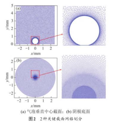 圖1所示為局部放大顯示的微電極表面單個氫氣泡生長示意圖。本文模擬設(shè)計的氣泡半徑Rb和氣泡接觸半徑Rc來源于恒電流密度為5 A/cm2條件下的氣泡幾何尺寸實驗,定義氣泡弧長從氣泡接觸點開始到氣泡頂點結(jié)束(圖1中深藍(lán)色弧線),氣泡接觸角為θ,氣液界面圓周角度為φ(φ≥θ)。計算區(qū)域的氣泡底部微液層為圓柱結(jié)構(gòu),微液層底部直徑與微電極直徑相同。為簡化求解,本文設(shè)計氣泡底部平均微液層厚度為5μm。在實際電解過程中,氣液界面和氣泡底部微液層區(qū)域的物理場參數(shù)變化較大,為保證計算結(jié)果的準(zhǔn)確性,需要對這2個區(qū)域進行網(wǎng)格加密處理。圖2所示為三維圓柱模型中的氣泡垂直中心截面和陰極底部面的網(wǎng)格劃分和加密處理情況,從圖2可見:氣液界面和氣泡底部微液層區(qū)域的網(wǎng)格非常小,氣液界面最小網(wǎng)格尺寸為1.2μm,氣泡底部微液層最小網(wǎng)格尺寸為0.5μm。