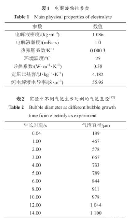 對于考慮Boussinesq假設(shè)的電解液自然對流過程,為了提高計算收斂穩(wěn)定性,采用非穩(wěn)態(tài)迭代方法進行計算,當(dāng)監(jiān)測的氣液界面若干位置處的溫度和速度保持不變,即認(rèn)為計算過程達到收斂。定義微電極表面為實際實驗的電流密度,定義陽極表面為壓力出口。將氣液界面定義為熱Marangoni對流邊界條件,表面張力隨溫度變化的系數(shù)為-1.5×10-4N/(m·K),其他壁面定義為無滑移壁面邊界條件。采用用戶自定義標(biāo)量函數(shù)UDS求解槽內(nèi)電勢分布,混合相電導(dǎo)率和焦耳熱源項均采用了用戶自定義函數(shù)UDF進行編程計算。計算過程中的連續(xù)性方程和動量方程均采用二階迎風(fēng)格式,能量方程和UDS方程采用Quick格式,壓力-速度耦合采用Phase-Coupled SIMPLE算法,所有計算方程的松弛因子均采用默認(rèn)值,時間步長為1 ms。模擬所需的電解液物性參數(shù)如表1所示,微液層內(nèi)氣體的體積分?jǐn)?shù)約為94%,計算得到微液層混合相電導(dǎo)率為2.28 S/m。為了系統(tǒng)研究氣泡生長周期內(nèi)氣泡周圍Marangoni對流效應(yīng)的演變規(guī)律,對不同氣泡生長時刻對應(yīng)的不同氣泡尺寸模型進行數(shù)值模擬,結(jié)果如表2所示。
