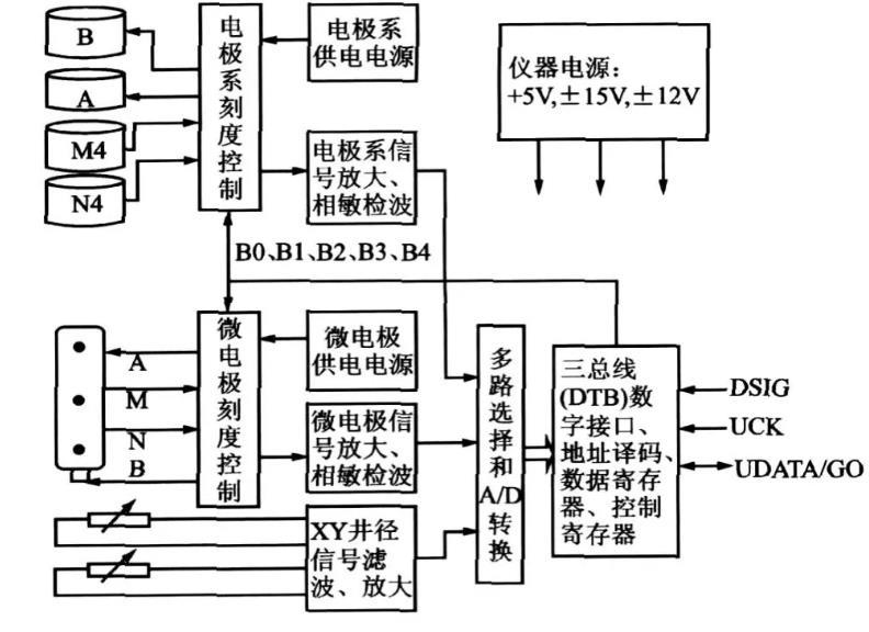 公共電子線路采用井下供電的方式,一次下井即可獲得4米、微電極、井徑和自然電位多種測井曲線。由RCC產生電極系和微電極的供電電流,由測量電極采集通過地層傳導后的電壓信號,經模數轉換,由數字接口經三總線傳到TCC進行遙測傳輸。其井徑推靠、刻度、測井控制都由地面發送命令進行控制。