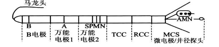 4米電極系的測量探頭位于TCC的上方。由玻璃鋼做成的絕緣層外殼,分成三根帶上下31芯接頭的硬電極,即B電極+萬能電極1+萬能電極2,組合而成。三根電極組合的長度,和軟電極一樣長,同時4米電極系電極的位置,和軟電極的位置距離一樣。這樣就可以在4米電極系測井儀下端,掛接別的測井儀器,并且還不影響自身的測量功能。