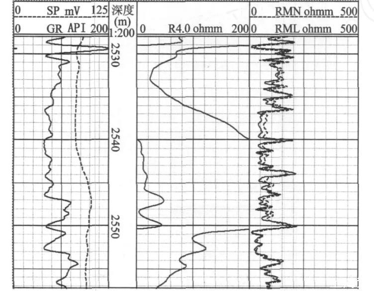 從圖中可以看出,微電位曲線(RMN)在泥巖段和微梯度(RML)曲線重合或略高,在砂巖段微電位曲線比微梯度曲線值高,在泥沙巖的剖面出現峰值,曲線正常。圖中截取的測井資料就是油層段的微電極曲線,4米電極曲線(R4.0)在油層出現高值,符合油層段曲線的規律。