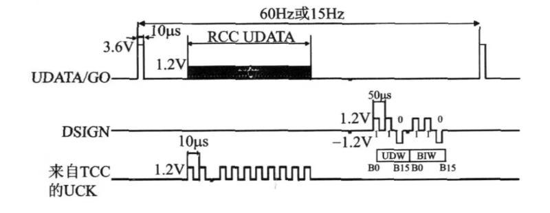 圖3中UDATA/GO、UCK、DSIG是RCC與TCC之間實現數據交換的三總線(DTB總線),儀器與總線的連接采用一種菊花鏈式連接,RCT與TCC的通訊采用半雙工的工作方式,其時序圖如圖4所示。