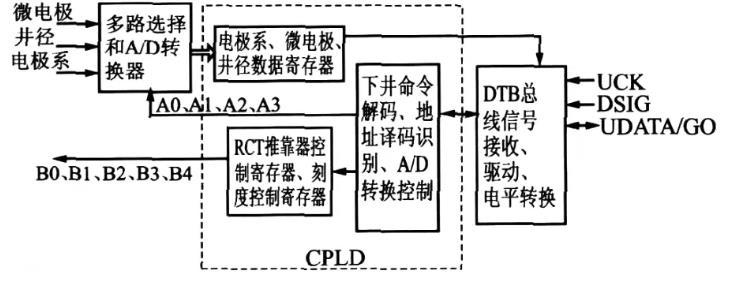 整個電路的通訊命令解碼、控制及數據A/D轉換、采集在CPLD可編程邏輯模塊內完成,從而達到井徑開關、刻度控制及上傳數據并串轉換。多路轉換和A/D轉換器的功能是將多種模擬信號(電極系、微電極、井徑信號)分時轉換成12位數字信號傳送給CPLD中的數據寄存器中,以便數字信號在UCK時鐘到來時順序上傳。DTB三總線信號接口接收器與驅動器的功能是接收三總線上的下行命令(DSIG,雙極性雙相位,±1.2V)、上傳時鐘(UCK)并進行電平幅度變換,將上傳數據進行電平幅度變換(+1.2V)上傳到三總線(UDATA/GO)上,再由TCC進行編碼后上傳地面進行計算處理、記錄、繪圖。