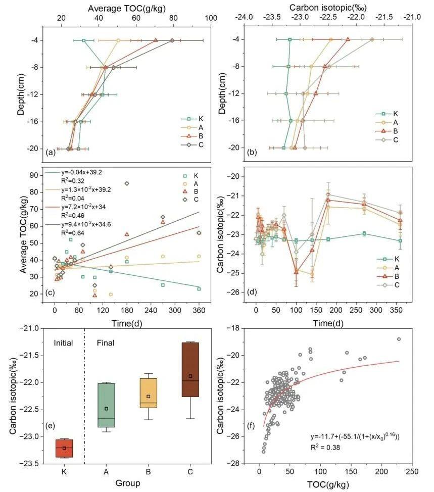 圖5微宇宙系統中不同藍藻生物量添加下(a)不同沉積物深度TOC平均濃度;(b)不同沉積物深度δ13C平均值;(c)培養周期內TOC濃度變化;(d)培養周期內δ13C變化;(e)初始和最終δ13C值;(f)TOC和δ13C的相關性。