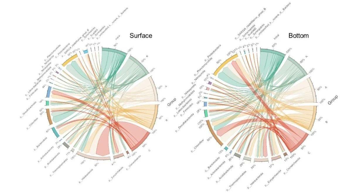 圖8微宇宙系統中不同藍藻生物量添加下(a)表層沉積物中初始和最終的微生物群落結構變化;(b)底層沉積物中初始和最終的微生物群落結構變化。