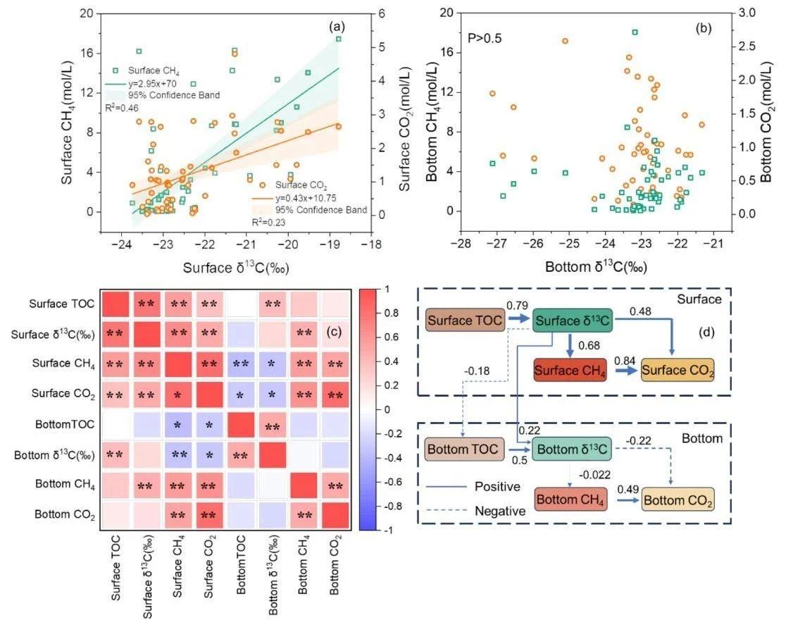 圖7微宇宙系統中不同藍藻生物量添加下(a)表層沉積物δ13C與溶存態CH4和CO2濃度的相關性;(b)底層沉積物δ13C與溶存態CH4和CO2濃度的相關性;(c)表底層沉積物中溶存態CH4和CO2濃度的影響因素;(d)藍藻衍生碳對表底層沉積物中溶存態CH4和CO2濃度的貢獻。