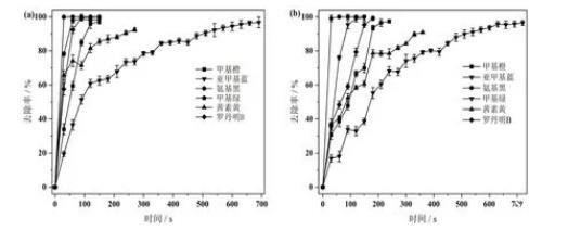 圖1(a)釕銥電極和(b)BDD電極對(duì)各種染料的去除效果圖