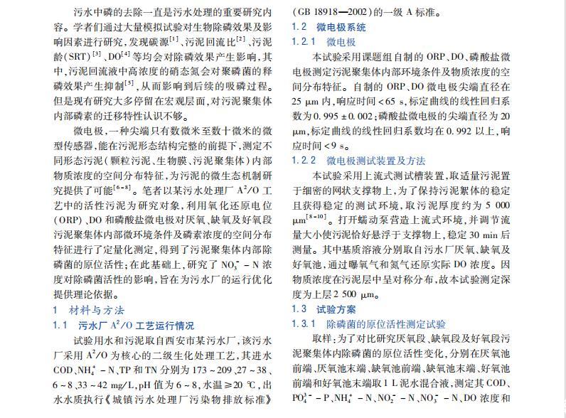 摘要:利用自制的磷酸鹽、DO、ORP微電極定量研究了某污水廠AVO工藝中厭氧、缺氧及好氧段污泥聚集體內(nèi)部微環(huán)境及磷酸鹽農(nóng)度的空間分布特征,獲得了除磷菌原位活性的變化規(guī)律。