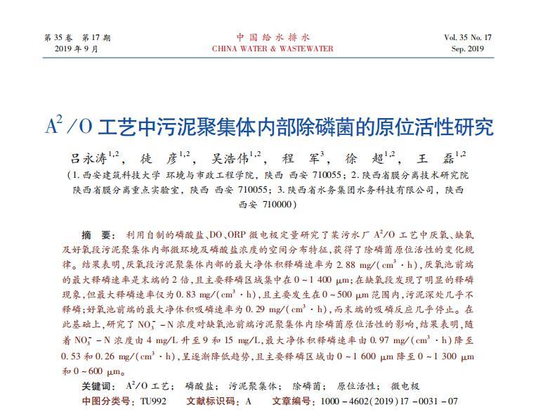 結(jié)果表明,厭氧段污泥聚集體內(nèi)部的最大凈體積釋磷速率為2.88mg/(cm^3·h),厭氧池前端的最大釋磷速率是末端的2倍,且主要釋磷區(qū)域集中在0——1400μm;在缺氧段發(fā)現(xiàn)了明顯的釋磷現(xiàn)象,但最大釋磷速率僅為0.83mg/(cm^3·h),且主要發(fā)生在0——500μm范圍內(nèi),污泥深處幾乎不釋磷;好氧池前端的最大凈體積吸罐速率為0.29mg/(cm^3·h),而末端的吸磷反應(yīng)幾乎停止。在此基礎(chǔ)上,研究了NO3^--N濃度對(duì)缺氧池前端污泥聚集體內(nèi)除磷菌原位活性的影響,結(jié)果表明,隨著NO3^--N濃度由4mg/L升至9和15mg/L,最大凈體積釋磷速率由0.97mg/(cm^3·h)降至0.53和0.26mg/(cm^3·h),呈逐漸降低趨勢(shì),且主要釋鱗區(qū)域由0——1600μm降至0——1300μm和0-600μm。
