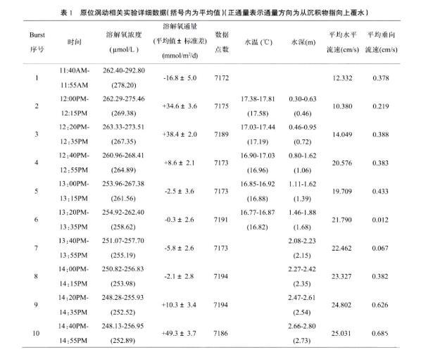 表1原位渦動相關實驗詳細數據(括號內為平均值)(正通量表示通量方向為從沉積物指向上覆水)