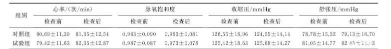 所有患者均取左側(cè)臥位,心電監(jiān)護(hù)及吸氧,檢查前20 min應(yīng)用硫酸阿托品,使用劑量為1 mg,用藥方式為肌內(nèi)注射,在此基礎(chǔ)上給予對(duì)照組患者采用術(shù)前丙泊酚靜脈注射,按丙泊酚2 mg/kg緩慢靜脈注射,并同時(shí)進(jìn)鏡至意識(shí)消失后以1~4.5 mg/(kg·h)速度維持,腸鏡進(jìn)至回盲部停藥。試驗(yàn)組采用氧化亞氮吸入鎮(zhèn)痛,操作進(jìn)行時(shí)先將面罩固定,給予患者純氧深呼吸,吸入6 min左右以適應(yīng)面罩呼吸狀態(tài),然后逐漸加入氧化亞氮,從混合氣體中氧化亞氮體積分?jǐn)?shù)于0.30起,維持約1 min后加量10%/min,密切觀察脈搏血氧飽和度,維持混合氣體氧化亞氮體積分?jǐn)?shù)于0.50~0.70,維持3 min左右,待患者相對(duì)放松,自覺有輕飄感后開始腸鏡檢查,待腸鏡檢查至回盲部時(shí)關(guān)閉笑氣,給予純氧吸入。2組患者均待復(fù)蘇成功后停止吸氧。