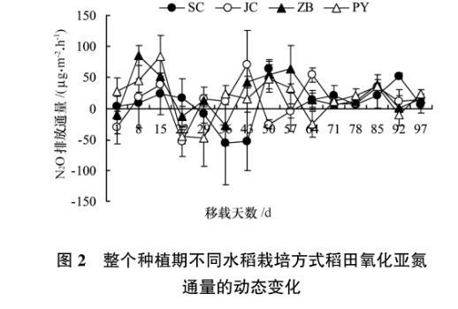 2.1栽培方式對(duì)生長(zhǎng)期稻田氧化亞氮通量季節(jié)變化的影響