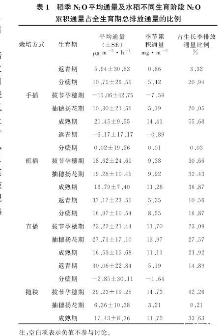 表1稻季N2O平均通量及水稻不同生育階段N2O累積通量占全生育期總排放通量的比例