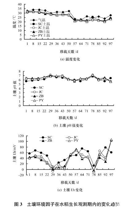 圖3土壤環(huán)境因子在水稻生長(zhǎng)觀測(cè)期內(nèi)的變化趨勢(shì)