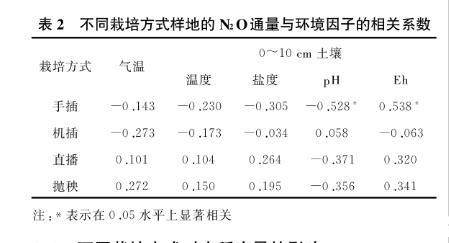 不同栽培方式、稻田不同環(huán)境因子在整個(gè)觀測(cè)期內(nèi)的變化趨勢(shì)如圖3所示。不同水稻栽培方式的稻田氧化亞氮通量與環(huán)境因子的相關(guān)關(guān)系見表2。結(jié)果表明,在本研究中,除手插樣地的土壤pH和Eh對(duì)稻田氧化亞氮通量影響顯著外外,其他因子與不同栽培方式的樣地氧化亞氮通量的關(guān)系則不顯著,這說明其變化可能受到多因子的協(xié)同影響。