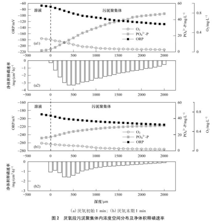 厭氧段污泥聚集體內(nèi)釋磷原位生物活性的變化規(guī)律見圖2.由圖2(a)可見,厭氧初始1 min,DO和ORP隨深度增加均呈降低的趨勢(shì),其中,DO由0.28mg·L-1降至0.05mg·L-1,ORP由~67.58 mV降至~128.41 mV,可知污泥聚集體內(nèi)部為厭氧環(huán)境。PO43--P濃度呈逐漸升高的趨勢(shì),最大值為47.18mg·L-1.經(jīng)計(jì)算,其最大釋磷速率發(fā)生在表層500μm左右,達(dá)到3.30 mg·(cm3·h)~1.
