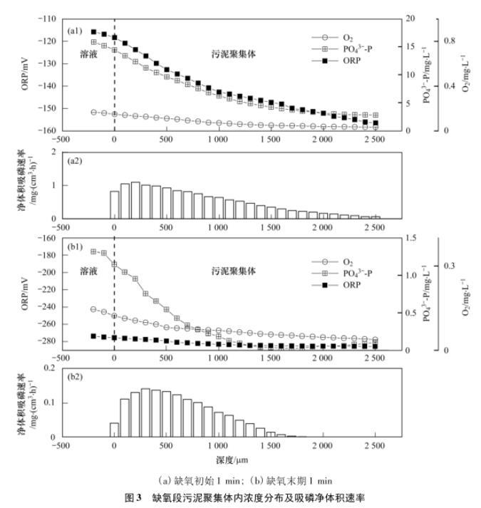 缺氧段污泥聚集體內(nèi)吸磷速率,結(jié)果見圖3.由圖3(a)可見,缺氧初始1 min,污泥聚集體內(nèi)DO濃度變化不大,由0.17mg·L-1降至0.03mg·L-1;ORP迅速降低,由表層的~115.76 mV降至~156.46 mV;PO43--P濃度呈下降趨勢(shì),由15.88mg·L-1降至2.80mg·L-1.經(jīng)計(jì)算,最大凈體積吸磷速率發(fā)生在200μm處,為1.10mg·(cm3·h)~1。