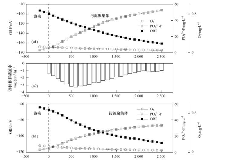 綜上所述,相比于厭氧初期,末期的最大凈體積釋磷速率大大減小,僅為初期的一半左右。污泥深層區(qū)域(>1000μm),厭氧末期的釋磷反應(yīng)基本停止。此外,最大凈體積釋磷速率均發(fā)生在表層400——500μm處,此處的ORP分別為~93.62 mV(初期)和~201.63 mV(末期),說(shuō)明,碳源充足條件下,只要ORP低于~93.62 mV均可獲得最高釋磷速率。與宏觀試驗(yàn)發(fā)現(xiàn)ORP能指示厭氧釋磷的結(jié)果相一致。另外,當(dāng)污泥聚集體(生物膜或顆粒污泥)厚度超過(guò)500μm,可能會(huì)因傳質(zhì)受限影響釋磷速率。