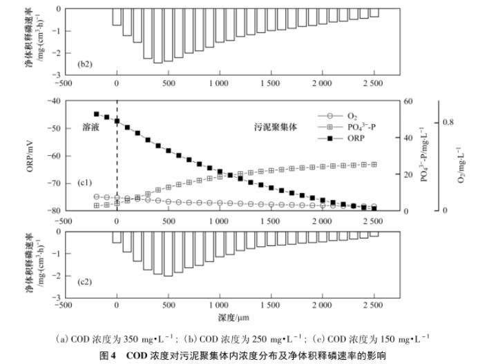 在厭氧初始1 min取樣,研究不同COD濃度對(duì)污泥聚集體內(nèi)原位釋磷活性的影響,結(jié)果見圖4.從中可知,3組試驗(yàn)中DO變化值較小,均為0.07——0.09mg·L-1.隨著COD濃度(mg·L-1)由350降至250和150,ORP在整個(gè)污泥聚集體中的變化值呈降低趨勢(shì),分別為68.00、44.07和34.56 mV,最大釋磷凈體積速率分別由3.27 mg·(cm3·h)~1降至2.44 mg·(cm3·h)~1和2.01 mg·(cm3·h)~1.表明高濃度的COD,同時(shí)降低了ORP并提高了釋磷速率。此外,隨著初始COD濃度的降低,快速釋磷區(qū)域向污泥聚集體的表層收窄,原因是低COD濃度導(dǎo)致傳質(zhì)減弱,使污泥整體釋磷活性降低。