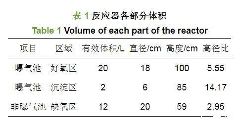 首先生活污水由水泵進(jìn)入缺氧反應(yīng)區(qū)(圖1中b區(qū)),然后經(jīng)過缺氧攪拌的生物反應(yīng)后,帶有顆粒污泥的廢水流入好氧反應(yīng)區(qū)(圖1中a區(qū))。在顆粒污泥選擇區(qū)(圖1中c區(qū))中,沉淀性能較好的顆粒污泥在沒有水泵提供任何壓力的情況下會自動回落到好氧區(qū)(圖1中a區(qū)),實(shí)驗(yàn)裝置如圖1所示,各部分體積如表1所示。反應(yīng)器具體運(yùn)行參數(shù)見表2.