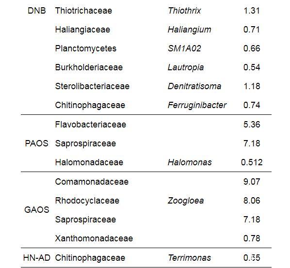 分別將所得的微生物種群在科級和屬級歸類為不同的微生物功能菌群,分析了連續(xù)流脫氮除磷系統(tǒng)的微生物群落結(jié)構(gòu)。分類結(jié)果如表6所示,功能菌群有氨化細菌、氨氧化菌(AOB)、亞硝酸鹽氧化菌(NOB)、反硝化菌(DNB)、異養(yǎng)硝化~好氧反硝化細菌(HN-AD)、聚磷菌(PAOs)和聚糖菌(GAOs)。