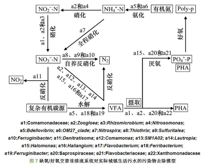結(jié)合功能菌群的分類結(jié)果,建立缺氧/好氧交替連續(xù)流系統(tǒng)對實際城鎮(zhèn)生活污水的污染物去除模型如圖7,首先生活污水中的復雜有機物首先通過Ferribacteriu屬和Ferruginibacter屬水解為VFA.污水中的氮分為有機氮和無機氮,污水中的有機氮通過Bdellovibrio屬和OM27_clade屬的氨化作用分解含氮有機化合物釋放NH4+-N,這些細菌具有循環(huán)利用有機氮的作用,其中OM27_clade屬隸屬于球孢菌科(Bdellovibrionaceae)的OM27進化枝成員,是未經(jīng)培養(yǎng)的微生物群。污水中的NH4+-N通過Zoogloea屬及Nitrosomonas屬硝化成NO2--N,其由Comamonadaceae科、Zoogloea屬和Rhizomicrobium屬進一步硝化成NO3--N,同時還有全程硝化細菌Nitrospira屬同時擁有氨氧化功能和亞硝酸氧化功能,將NH4+-N硝化成硝氮。緊接著污水中NO3--N反硝化成為N2,在顆粒污泥中發(fā)現(xiàn)了幾種反硝化細菌,第一種是利用VFA進行反硝化的細菌,有以VFA中的乙酸為碳源進行反硝化的Halomonas屬和Comamonas屬、也有利用其它VFA進行反硝化的Zoogloea屬、SM1A02屬、Lautropia屬、Haliangium屬和Flavobacterium屬,第二種是自養(yǎng)反硝化細菌,有利用硫基進行自養(yǎng)反硝化的Thiothrix屬和Sulfuritalea屬,也有利用鐵進行自養(yǎng)反硝化的Ferruginibacter屬,第三種是直接利用污水中復雜有機碳源進行反硝化的Denitratisoma屬。可見,由于實際生活污水中的有機碳大部分以復雜化合物(如蛋白質(zhì),脂類和多糖)的形式存在,所以在連續(xù)流系統(tǒng)中發(fā)現(xiàn)了多種利用不同碳源的反硝化細菌,促進了生活污水中各種碳源的利用。