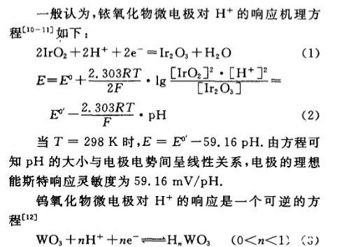 鎢氧化物微電極對(duì)H具有良好的響應(yīng)是由于它遵從這樣一個(gè)質(zhì)子參與的氧化還原反應(yīng),在這個(gè)可逆反應(yīng)過程中,參加反應(yīng)質(zhì)子數(shù)改變了膜中的氧化物的比例,從而改變膜電位,理想能斯特響應(yīng)為59.16mV/pH.