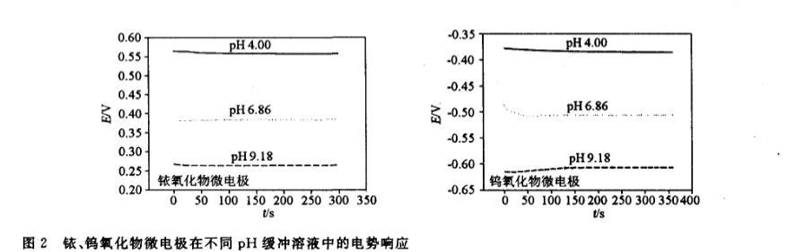 為了測試金屬氧化物電極長時(shí)間工作電勢的穩(wěn)定性,在pH 9.18緩沖溶液和自來水(pH一7.12)中連續(xù)測量2h,觀察其電勢變化曲線。結(jié)果表明鎢和銥氧化物微電極在兩種溶液中電勢變化均小于3mV/h.