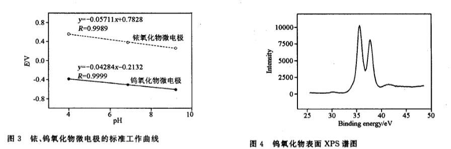 至4h,形成的黑色氧化膜與金屬基底結(jié)合緊密。碳酸鈉熔點(diǎn)851℃,在高溫18oo℃下分解,實(shí)驗(yàn)表明,加熱至850℃,冷卻后的氧化膜也有明顯的粘附現(xiàn)象,因此經(jīng)過實(shí)驗(yàn)調(diào)整,碳酸鈉氧化溫度同樣選擇為80o℃。制備鎢氧化物微電極的氧化溫度選擇在5O0℃,低于碳酸鹽的熔點(diǎn),但將所制作電極做鎢元素的XPS分析后,從譜圖(圖4)上看,W 4f5,。結(jié)合能為35.7eV,說明金屬表面膜中鎢的確氧化為+6價(jià)。