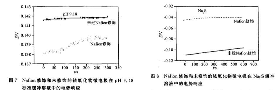 圖8 Nafion修飾和未修飾的銥氧化物微電極在Na。S緩沖溶液中的電勢響應
