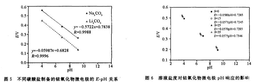 用pH 4.O0,6.86,9.18系列的標準緩沖溶液測定碳酸鈉與碳酸鋰兩種熔融介質制備的銥氧化物微電極,從EpH關系圖上看,雖然電勢值有所差別,但是響應靈敏度都接近理想能斯特方程斜率,兩者差異不大(圖5)。