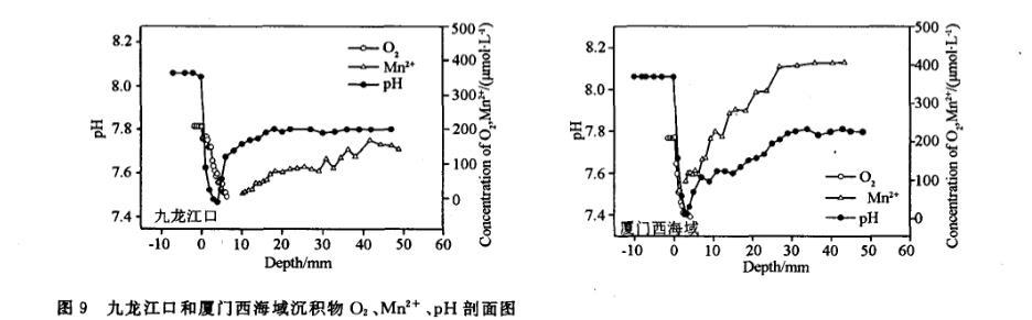 圖9九龍江口和廈門西海域沉積物0z、Mn2、pH剖面圖