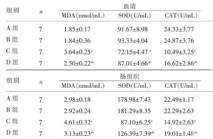 目的觀察氫氣吸入對重度膿毒癥小鼠腸黏膜屏障功能、腸道組織氧化還原狀態(tài)的影響,并探討其機制。方法選取美國癌癥研究所雄性小鼠56只,體質量20~25 g,均為5周齡,采用隨機數(shù)字表法將其分為四組:假手術組(A組)、假手術+氫氣組(B組)、膿毒癥組(C組)和膿毒癥+氫氣組(D組),每組14只。采用盲腸結扎穿孔(CLP)法制備小鼠膿毒癥模型。B組和D組于CLP后1、6 h吸入2%氫氣1 h。CLP后24 h進行行為學評分;采集靜脈血檢測血中生化指標[丙氨酸氨基轉移酶(ALT)、天門冬氨酸氨基轉移酶(AST)、尿素氮(BUN)、肌酐(Cr)];隨后處死小鼠取中段空腸,對腸道組織進行原位末端脫氧核苷酸轉移酶標記法(TUNEL)染色,觀察腸道組織細胞凋亡情況并評分;檢測血液及腸道組織勻漿中丙二醛(MDA)水平及過氧化氫酶(CAT)、超氧化物歧化酶(SOD)的活力。結果與A組比較,C組和D組行為學評分、腸道組織凋亡指數(shù)、血生化指標(ALT、AST、BUN、Cr)水平及血清和腸道組織MDA水平升高,SOD和CAT活力降低,差異均有統(tǒng)計學意義(P<0.05),而B組上述指標與A組比較,差異均無統(tǒng)計學意義(P>0.05);與C組比較,D組行為學評分、腸道組織凋亡指數(shù)、血生化指標水平及血清和腸道組織MDA水平降低,SOD和CAT活力升高,差異均有統(tǒng)計學意義(P<0.05)。結論氫氣吸入對重度膿毒癥小鼠腸損傷和腸黏膜屏障功能破壞有明顯保護作用,可能與其抗凋亡作用及對內源性氧化還原平衡狀態(tài)的維持有關。