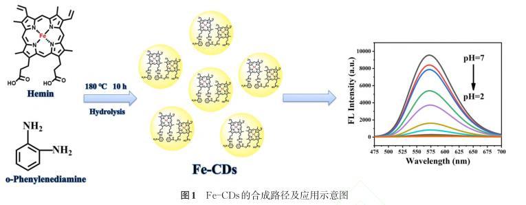 圖1 Fe-CDs的合成路徑及應用示意圖