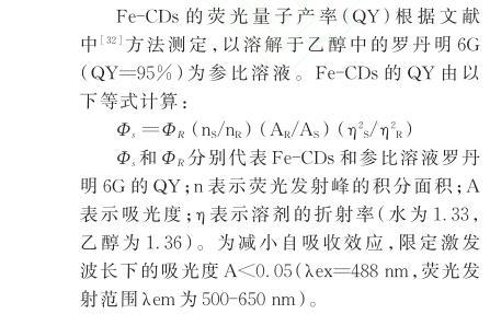 Fe-CDs的熒光量子產率(QY)測定,以溶解于乙醇中的羅丹明6G(QY=95%)為參比溶液。Fe-CDs的QY由以下等式計算: