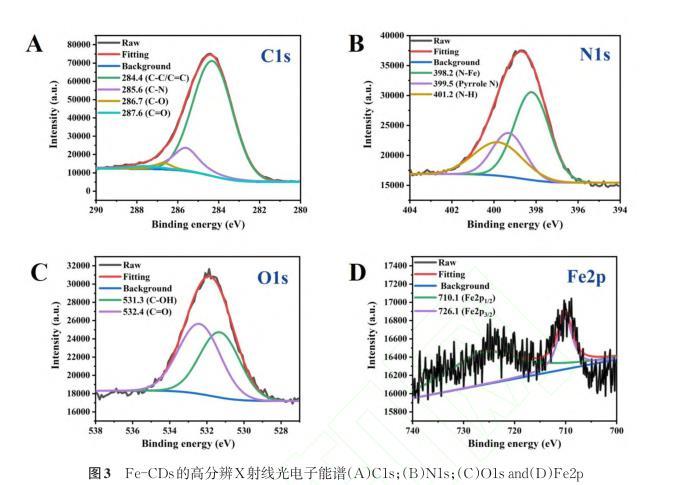 通過X射線光電子能譜(XPS)驗證Fe-CDs中元素組成,如圖2(d)中出現四個特征結合能峰,分別位于285.6 eV、399.1 eV、532.0 eV和715.1 eV,表明Fe-CDs除H元素外還有C、N、O、Fe四種元素。高分辨率XPS譜顯示,C 1s是由284.4 eV(C-C/C=C),285.6 eV(C-N),286.7 eV(C-O)和287.6 eV(C=O)四個特征峰構成的(圖3a)。N 1s譜中顯示了398.2 eV(N-Fe),399.5 eV(吡咯N)和401.2 eV(N-H)三個特征峰(圖3b)。由圖3C可以看出,O 1s譜是由531.3 eV(C-OH)和532.4 eV(C=O)兩個特征峰構成的。Fe 2p譜中顯示了碳點中Fe的710.1 eV(Fe 2p1/2)和726.1 eV(Fe 2p3/2)兩個特征峰(圖3d)。XPS光譜結果與紅外光譜具有良好的一致性,進一步證明了鐵元素的成功摻雜。