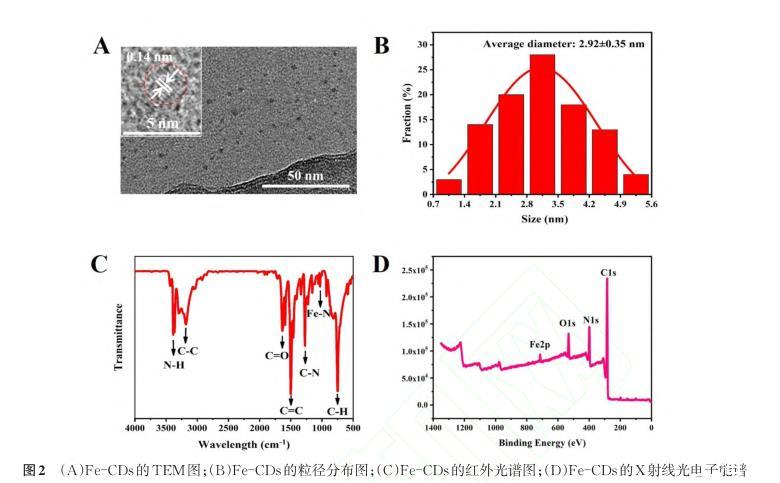 圖2(a)Fe-CDs的TEM圖;(b)Fe-CDs的粒徑分布圖;(c)Fe-CDs的紅外光譜圖;(d)Fe-CDs的X射線光電子能譜