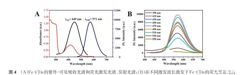 圖4(a)Fe-CDs的紫外-可見吸收光譜和熒光激發(fā)光譜、發(fā)射光譜;(b)在不同激發(fā)波長激發(fā)下Fe-CDs的熒光發(fā)射光譜