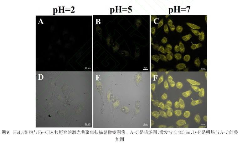 由于Fe-CDs具有良好的光學(xué)性能及穩(wěn)定的生物相容性,探索了其作為熒光探針在監(jiān)測細(xì)胞內(nèi)pH的可能性。用人宮頸癌HeLa細(xì)胞為模型,將濃度為0.1 mg/mL的不同pH值的(pH=2,5,7)Fe-CDs與HeLa細(xì)胞共孵育半小時(shí)進(jìn)行細(xì)胞成像實(shí)驗(yàn),觀察細(xì)胞形態(tài)變化以及細(xì)胞內(nèi)熒光變化。如圖9所示,F(xiàn)e-CDs分布于細(xì)胞膜、細(xì)胞質(zhì)甚至細(xì)胞核區(qū)域,說明Fe-CDs具有良好的細(xì)胞通透性。當(dāng)pH為7時(shí),細(xì)胞內(nèi)的熒光強(qiáng)度最強(qiáng)(c和f);當(dāng)pH為5時(shí),F(xiàn)e-CDs的熒光強(qiáng)度部分猝滅(b和e);當(dāng)pH為2時(shí),F(xiàn)e-CDs的熒光強(qiáng)度幾乎全部被猝滅(a和d)。這與體外實(shí)驗(yàn)結(jié)果一致,也進(jìn)一步表明了Fe-CDs可作為一種良好的pH熒光探針用于細(xì)胞內(nèi)pH水平的監(jiān)測。