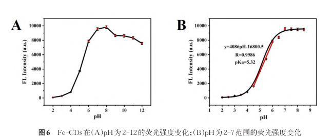 pH在很大程度上影響著機(jī)體的正常功能,開發(fā)用于監(jiān)測細(xì)胞內(nèi)pH變化的新型熒光探針對(duì)于研究pH影響的相關(guān)的疾病具有重要意義。由于Fe-CDs表面存在豐富的活性官能團(tuán),我們探索了其在傳感器領(lǐng)域的潛在應(yīng)用。如圖6(a)所示,F(xiàn)e-CDs在酸性環(huán)境下的熒光強(qiáng)度隨著pH的減小逐漸降低(λex=449 nm,λem=571 nm)。當(dāng)pH降低至2時(shí),F(xiàn)e-CDs 95%的熒光強(qiáng)度被猝滅;當(dāng)pH為7時(shí)Fe-CDs熒光強(qiáng)度達(dá)到最高值。在堿性環(huán)境下,隨著pH的逐漸增大,F(xiàn)e-CDs熒光強(qiáng)度變化不大。通過玻爾茲曼函數(shù)擬合曲線,得到Fe-CDs的pKa為5.32,且在pH 4.4~6.2范圍內(nèi),F(xiàn)e-CDs熒光強(qiáng)度與pH具有良好的線性相關(guān)性,y=4086 pH-16 800.5(圖6b)。上述實(shí)驗(yàn)結(jié)果證明Fe-CDs可作為監(jiān)測酸性條件下pH變化的新型熒光探針。